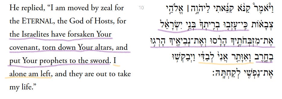 Instead, I’ll move on to note the words underlined in yellow above. “I alone am left,” Elijah says. Or more literally, “And I remain, all alone.” Like the earlier passage about Elijah’s 40-day-and-night trek to Horeb, this statement by Elijah also evokes another famous biblical text. The Hebrew word that translates to “and I remain” here strongly alludes to Genesis 32:25.