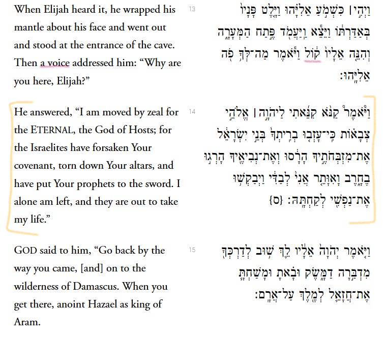 Let's pick up the story with the 2023 Jewish Publication Society (JPS) translation. The “he” in the passage is Elijah. I’m breaking up the following passage into subunits so I can comment on them as we move through it.