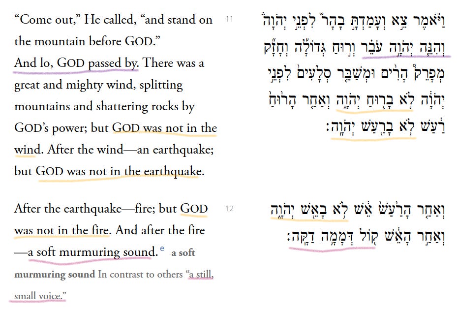 The first underlined words in purple above — “And lo, God passed by” — connect this story to Exodus 34. In that scene, Moses has followed God’s instructions to carve a set of stone tablets to take up the sacred mountain. The reason Moses has to carve these tablets is because he shattered the set God originally gave him, with the Ten Commandments inscribed upon them, when he saw the Hebrews worshipping the golden calf. This is God giving the Hebrews a second chance.