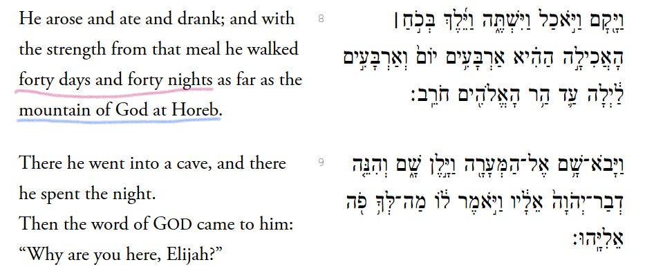 Elijah heads for the wilderness mountain of God, the site of God's revelation of the Ten Commandments to the entire assembled people — the mountain called both Sinai and Horeb in the Hebrew Bible. (Here it’s called Horeb.) Elijah hikes for — wait for it — 40 days and 40 nights, when he finally arrives at the foot of Horeb.
