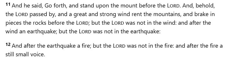 …but God was not in the fire. And after the fire, a still, small voice. And it was when Elijah listened that he wrapped his mantle around his face and went out and stood at the entrance of the cave.